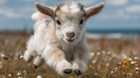 A charming baby goat joyfully leaps through a vibrant field of wildflowers, embodying playful energy and innocence against a scenic blue sky backdrop.
