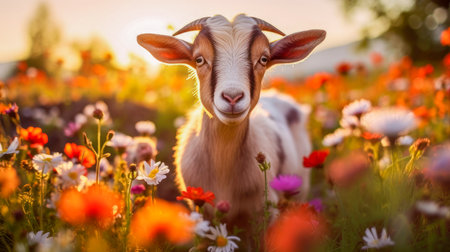 Cute goat in a field with flowers in nature, in the sun's rays. Environmental protection, the problem of ocean and nature pollution. Advertising for a travel agency, pet store, veterinary clinic, phone screensaver, beautiful pictures, puzzles