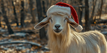 Charming Long Haired Goat in a Winter Wonderland, Wearing a Santa Hat, Perfect for Holiday Cheer