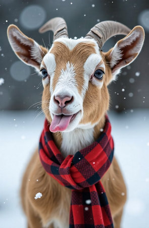 Cute goat in red scarf against snowfall background catches snowflakes with tongue