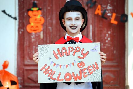 Young boy in costume holding paper with text Happy Halloween