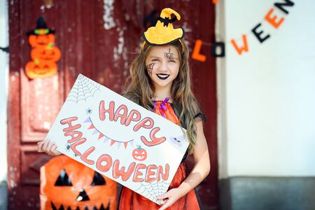 Beautiful girl in costume standing on porch and holding paper with text Happy Halloween