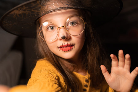 Halloween child in witch hat and glasses look like wizard school pupil, happy halloween holiday.