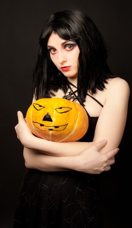 Strange woman in black dress holding halloween pumpkin