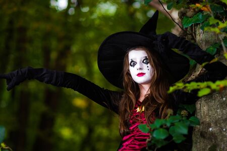 Teenage girl dressed in witch costume sitting on the tree, Halloween concept