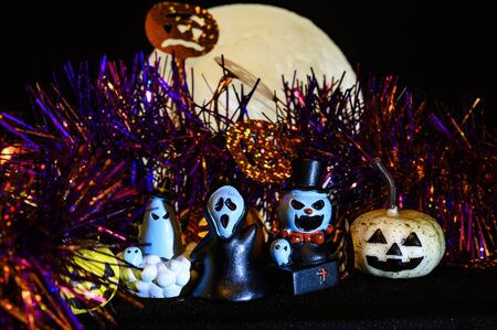 A close-up shot of Halloween pumpkins and ghosts on a black background.
