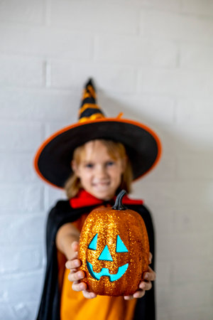 Defocus. Child dressed in a witch costume holds out a pumpkin with glowing eyes in front of him.