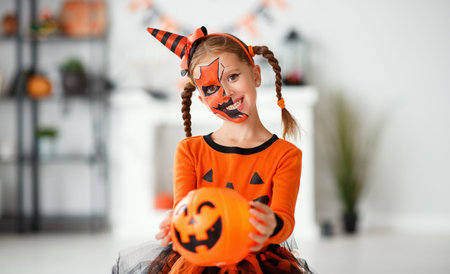 Happy Halloween day. A little cute girl in a witch costume is holding her pumpkin with candy in her hand. Halloween party, kids trick or treat, close-up.
