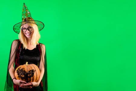 31 october. Happy Halloween. Witch hat. Happy Halloween weekend. Magic pumpkin. Pumpkin head jack lantern. Trick or treat. Glamour fashion sexy lady in witch costume with magic pumpkin. Charming witch