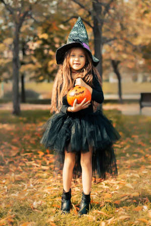 Terribly serious and dangerous witch, a girl dressed for halloween holiday and the pumpkins.