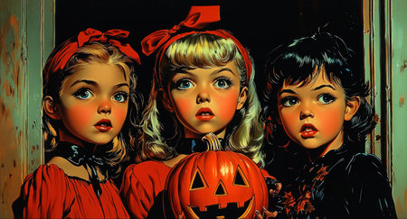 Three scared little girls holding carved Halloween pumpkin. Vintage Halloween card