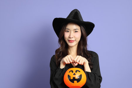 The beautiful East Asian woman in a Halloween costume is standing against a violet background.