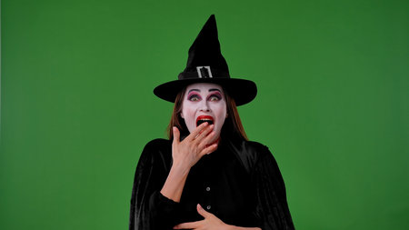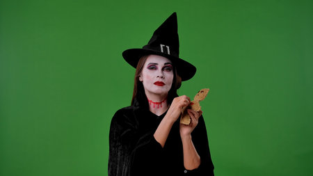 A witch with vampire makeup, wearing a black cloak and hat, poses with a piece of food against a green chroma key studio background