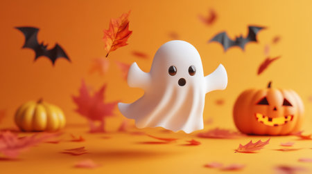Adorable ghost flying against an orange backdrop with leaves, pumpkin, and bats in minimalist style