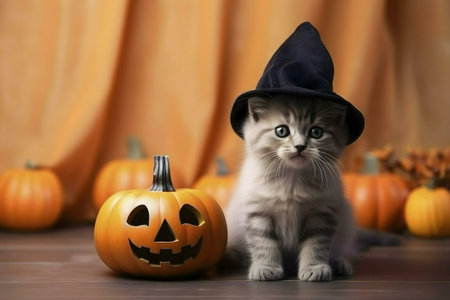 A charming kitten wearing a witch's hat sits near pumpkins.