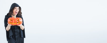 Banner halloween and masquerade concept - Funny young woman with Pumpkin Jack-o-lantern copy space