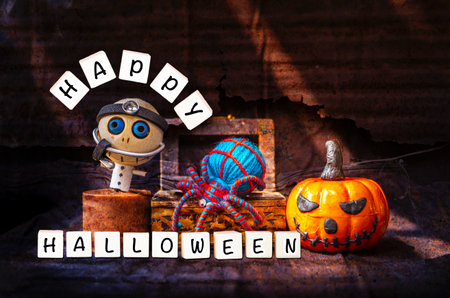 Happy halloween sign with ghost doctor with his blue spider in treasure box with Halloween pumpking on abstract old rusty metal texture background, Halloween concept background