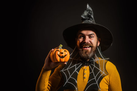 Funny model with Halloween pumpkin. Portrait of Man in Halloween hat with pumpkin. Trick or treat. Scary hipster with beard in Halloween hat. Man with witch hat hold pumpkin. Funny Halloween.
