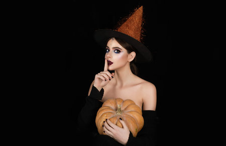 Halloween girl holding pumpkin. Sexy witch posing sensual in studio. Witchcraft theme with beauty woman with witch Halloween hat. Halloween glamour portrait of witch. Girl with Halloween makeup.