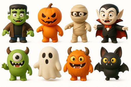 Cute halloween monsters illustration featuring vampire, mummy, and jack-o-lantern figures. concept of spooky fun, playful halloween decor, festive character collection. Set.