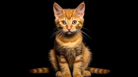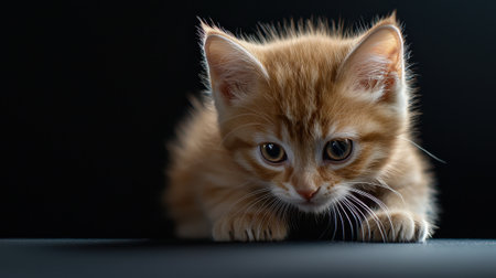 This charming orange kitten sits gracefully in a dimly lit space, exuding curiosity and innocence. Captured in a moment of tranquility, this image showcases the beauty of young felines.