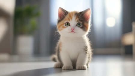 A charming calico kitten with a pink nose sits adorably in soft lighting, captivating viewers with its curious gaze and playful demeanor. Perfect for pet-themed visuals.