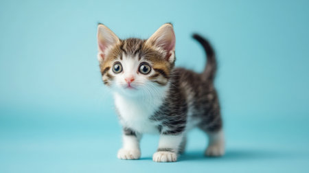 An adorable tabby kitten with an inquisitive gaze stands playfully against a blue background, embodying curiosity and cuteness. Perfect for pet lovers!