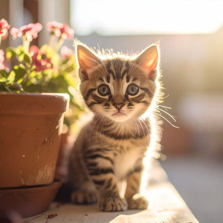 A charming tabby kitten sits near a window, showcasing its fluffy fur and bright eyes. This captivating scene captures the warmth and playful spirit of a beloved pet in a cozy indoor atmosphere.