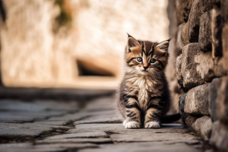 Cute little kitten sitting on the stone pavement. Selective focus.
