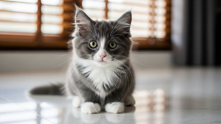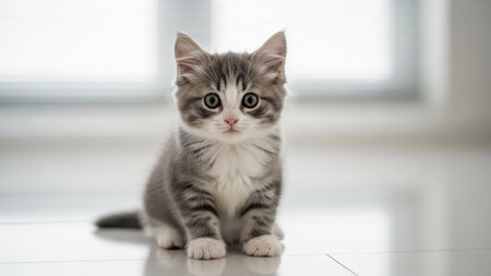 Cute grey tabby kitten sitting on a white floor indoors with a blurred background