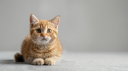 Orange kitten with wide eyes sitting on gray background