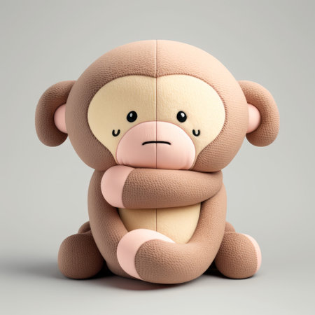 Soft toy monkey isolated on gray background. 3D rendering. Baby clothes.