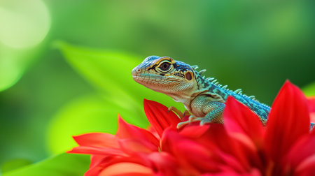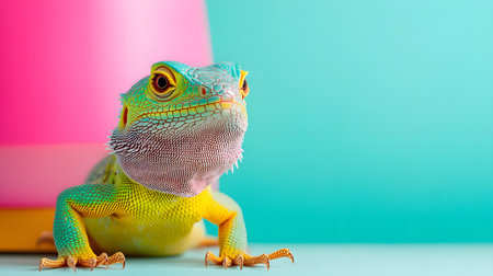 A vibrant close-up image of a reptile showcasing its colorful scales and striking eyes. The detailed texture highlights its natural beauty in a captivating pose.