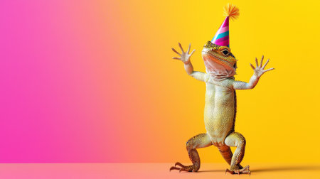 Colorful lizard wearing party hat dancing joyfully on vibrant background. concept of fun, celebration, playful reptile, birthday, funny animal, humor. Copy space.