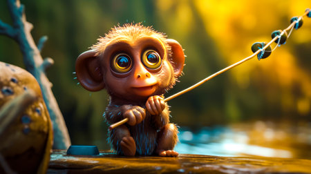 Small monkey sitting on log holding fishing rod. Generative AI.