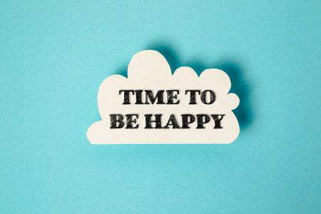A white cloud with the words Time to be happy written in black. Concept of positivity and hope, encouraging the viewer to focus on the present and find joy in the moment
