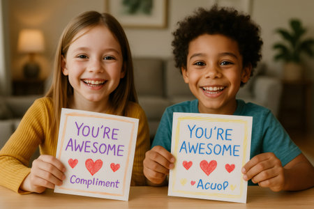 Two happy children sharing compliments and holding signs with the text you're awesome written on them