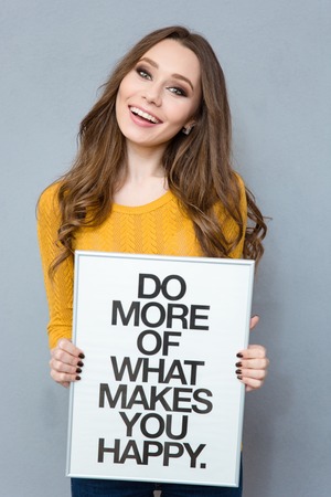 Portrait of a smiling cute woman holding board with text: do more of what makes you happy over gray background