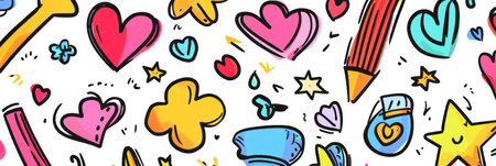Abstract seamless patterns set with grunge shapes and doodle objects. Hand drawn paint brush scribble curve color endless ornament collection. Kid scribbles, curved line texture. Vector isolated decor
