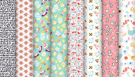 Vibrant textile patterns with abstract designs and floral motifs, arranged in a captivating layout, highlighting artistic creativity and colorful aesthetics, AI generated