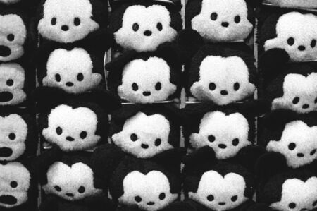 Rows of soft toys in the supermarket black and white