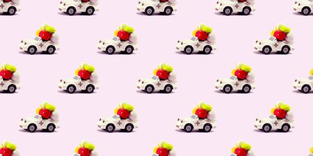 Seamless pattern with toy car and pills on pink background. Concept of emergency medical aid, health care, humanitarian assistance. Fight against coronavirus. Isometric texture