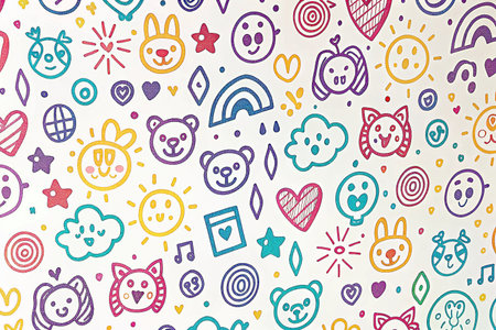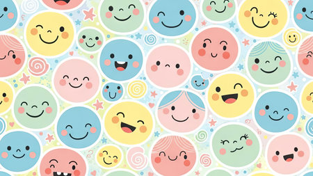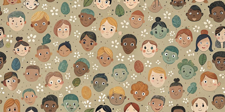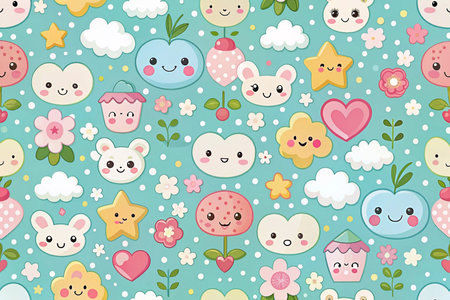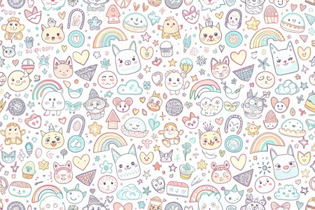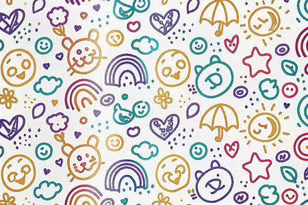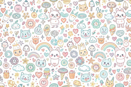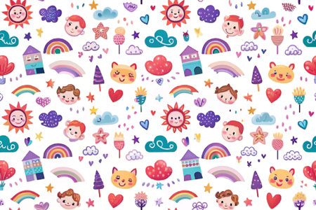 Cute kids' faces, rainbow, clouds, houses, and hearts seamless pattern
