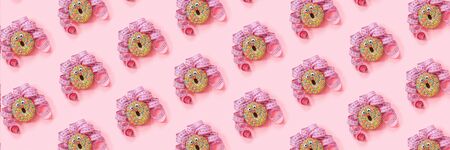 Donat pattern on pink background. Abstract funny face of woman from donut with eyes and hair from centimeter tape. Diet or unhealthy food concept Top view Flat lay Banner.