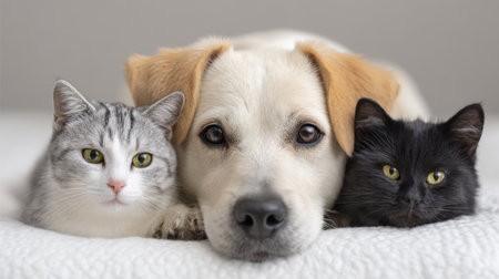 A heartwarming scene featuring a friendly dog and two charming cats snuggled together on a cozy bed, illustrating the joy and companionship of pets.