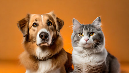 Portrait of a dog and a cat on an orange background.