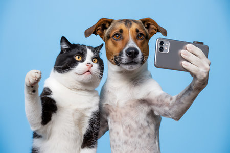 A cat and a dog taking a selfie with a smartphone on blue background