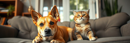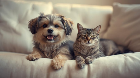 Cute dog and cat together on sofa at home. Pet care concept