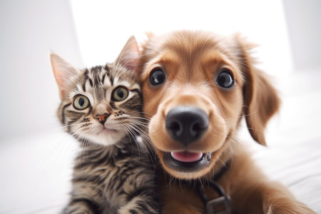 Dog and Cat frendship selfie photo, funny anthropomorphic animals, AI Generated