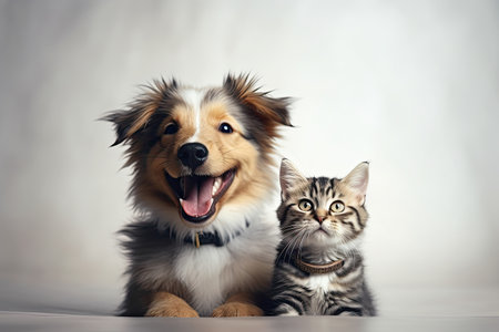 Portrait of a dog and a cat looking at the camera in front of a white background, Generative AI
